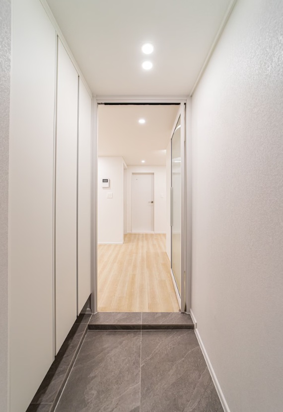 어두운 타일을 시공해 거실과 대비감이 느껴지는 현관이에요