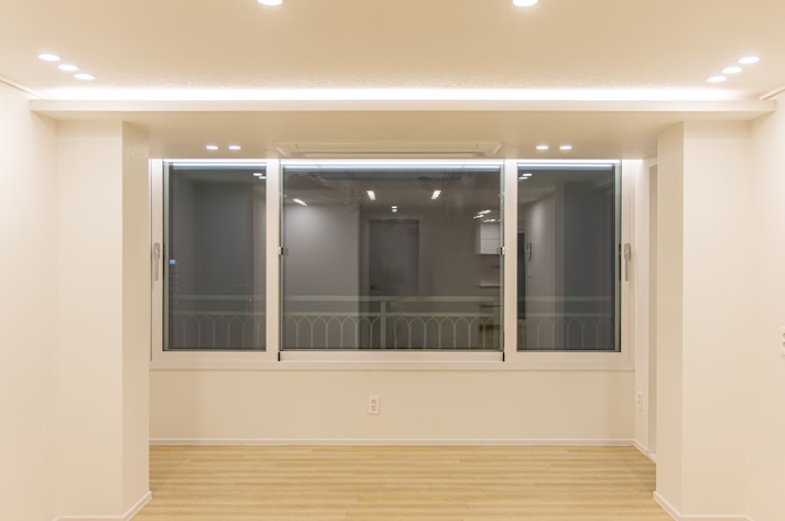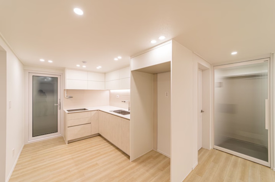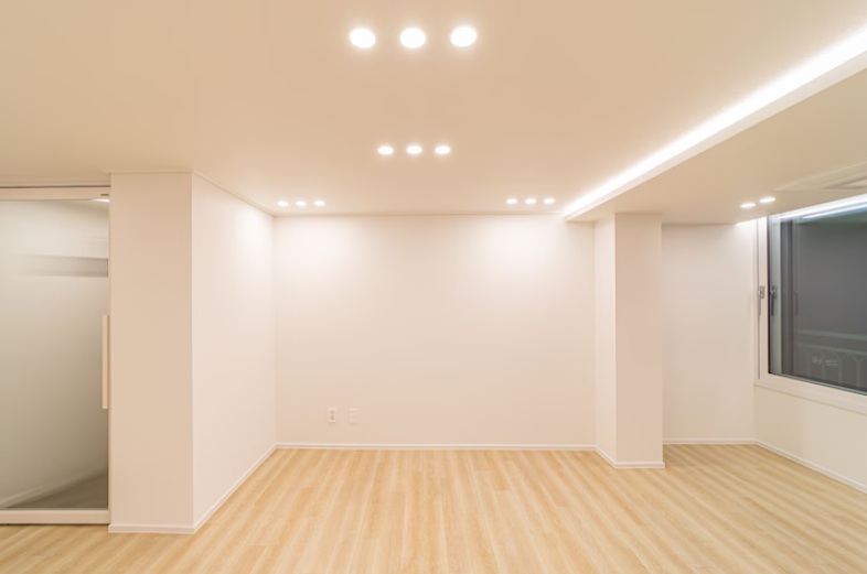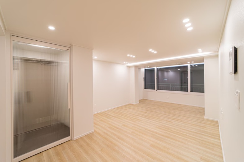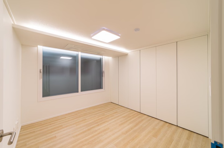 전체적으로 화이트톤을 중심으로 정리된 공간이며 바닥은 라이트 우드 톤 마루로 마감되어