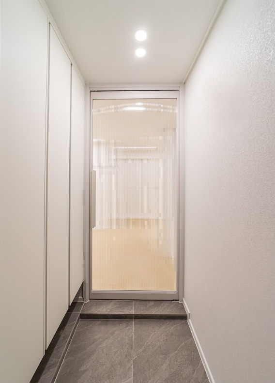 중문은 손이 많이 닿는 공간임을 고려하여 관리가 용이한 모루유리를 시공하였어요.