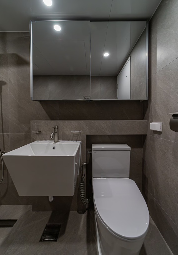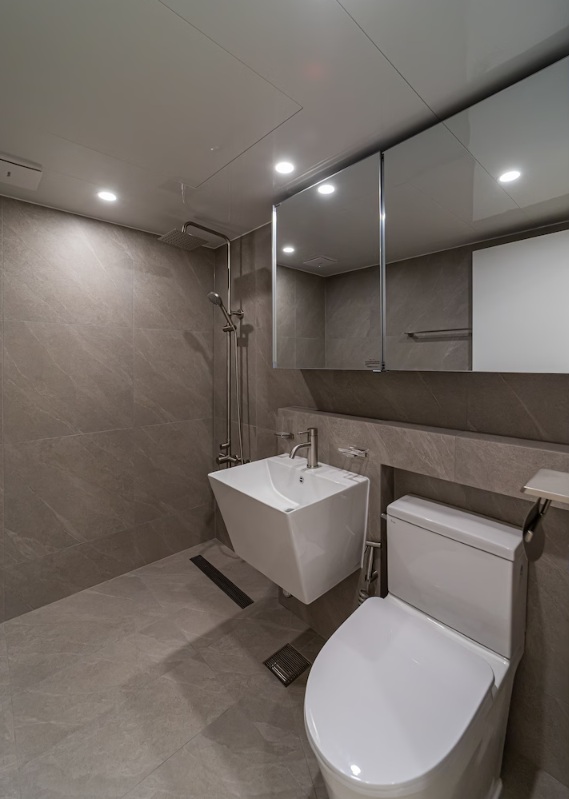 짙은 그레이톤의 대형 포세린 타일을 사용하여 차분하고 고급스러운 분위기가 완성된 욕실입니다.
