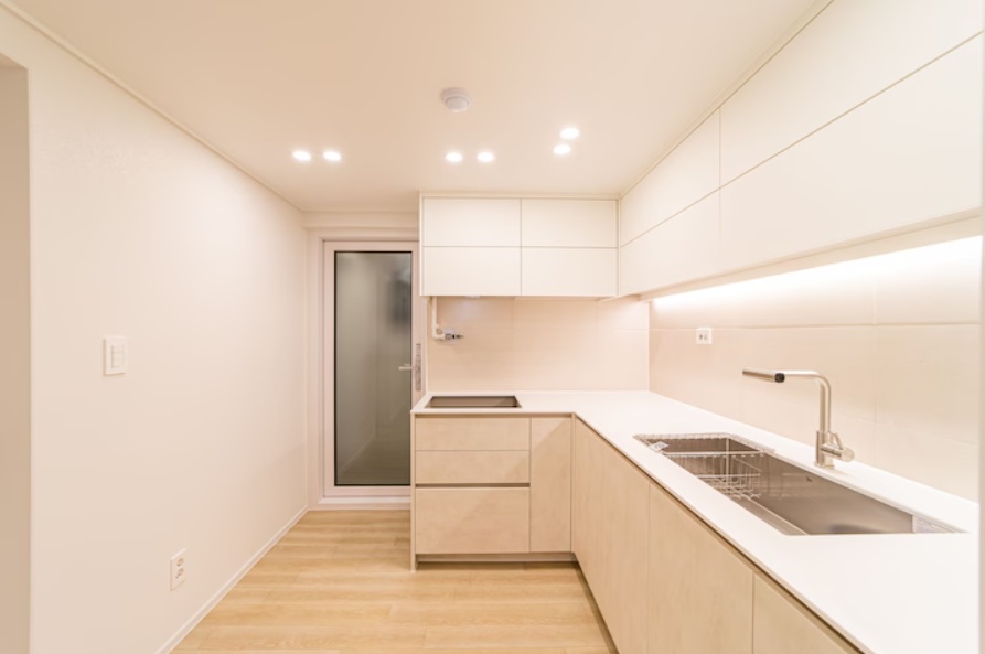 상부장 하부에는 간접조명이 일렬로 들어가 조리대 전체를 밝혀주는 방식이라 그림자 없이 밝고,