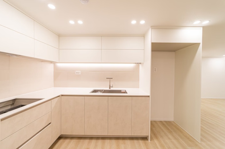 전체적으로 아이보리 톤과 연한 베이지 우드가 조화를 이루는 미니멀한 디자인이 특징인 주방입니다.