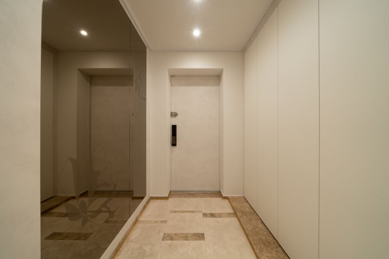 현관은 붙박이 신발장과 매립 슬라잉도어로