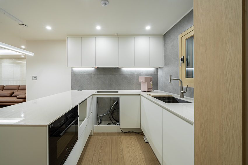 주방도 깔끔한 화이트 톤가구에 상부장에서 내려오는