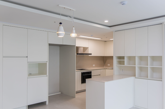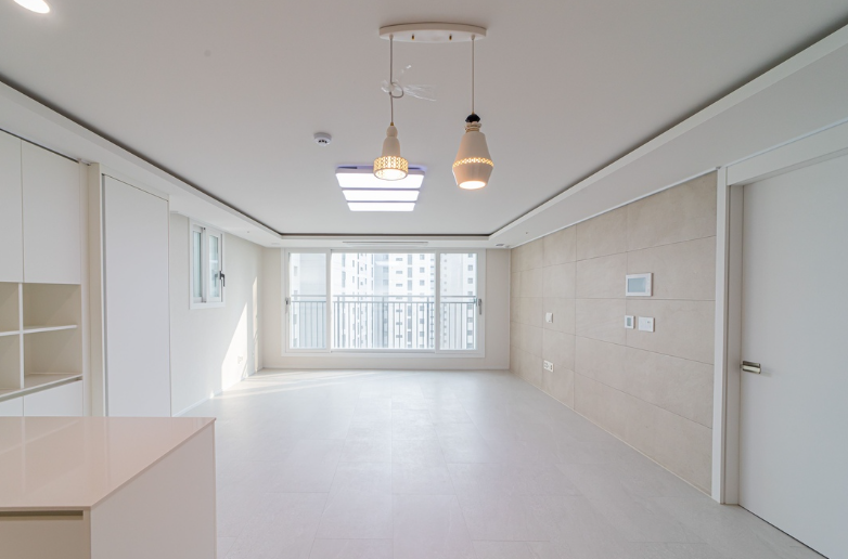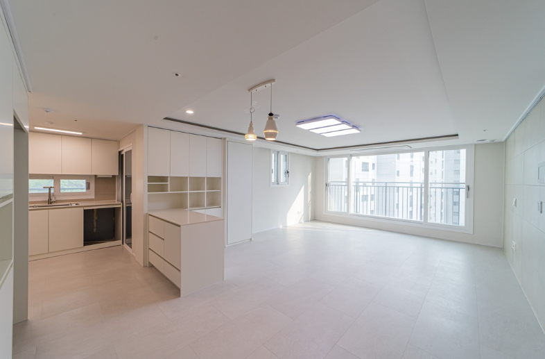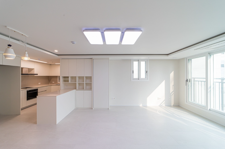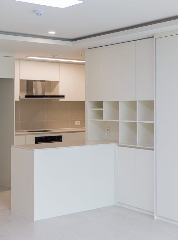 거실과 주방은 깔끔한 화이트로 마감하여 공간을 더욱 확장되게 보이는 효과를 연출했습니다.