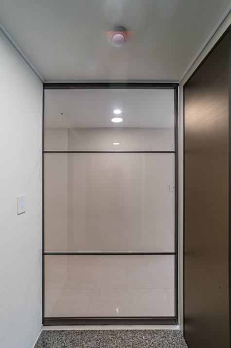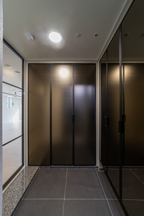 내부의 밝고 따뜻한 분위기를 극대화 시키기 위해, 현관은 약간은 어두운듯한 느낌을 주었습니다. 그러면서도 따뜻한 느낌의 연장감을 위해 신발장과 펜트리 도어에 브론즈경을 사용하였습니다.