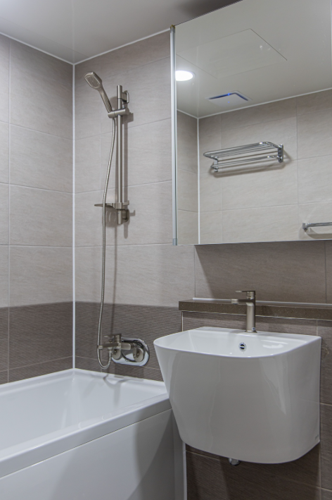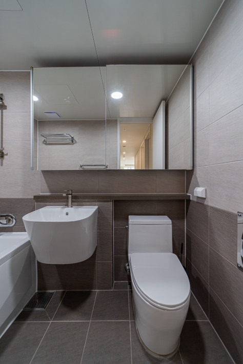 화장실은 깔끔함을 가장 중요하게 생각했으며, 타일과 어울리는 색상의 케라폭시를 시공했습니다.