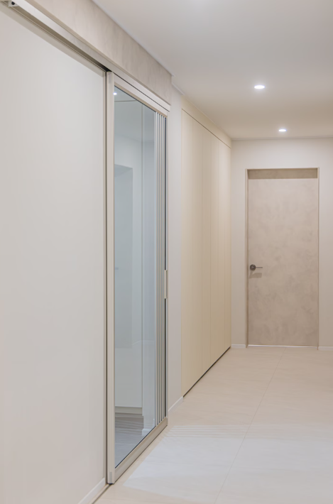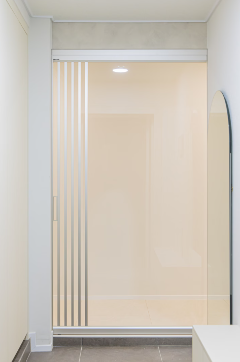 현관에는 간살 디테일이 돋보이는 원슬라이딩 중문을 설치했습니다.