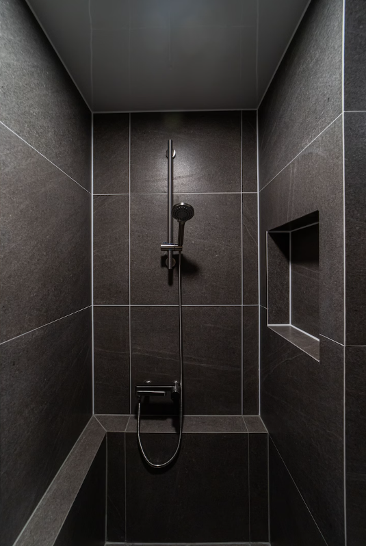세면대를 밖으로 옮긴 안방 화장실에는 600각 타일을 사용한 조적 욕조 시공으로 모던하고 고급스로운 느낌을 연출했습니다.