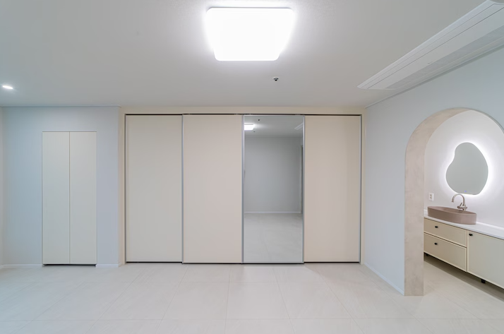 안방 붙박이장 도어에 대형 거울을 부착함으로써 실용적임과 동시에 공간을 넓어 보이게하는 효과를 주었습니다.