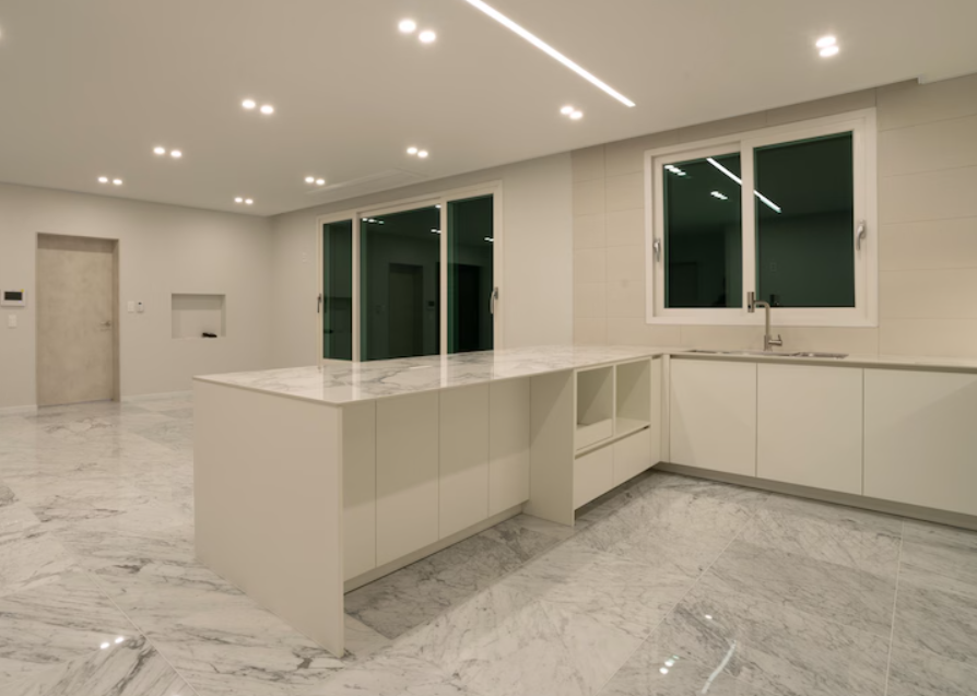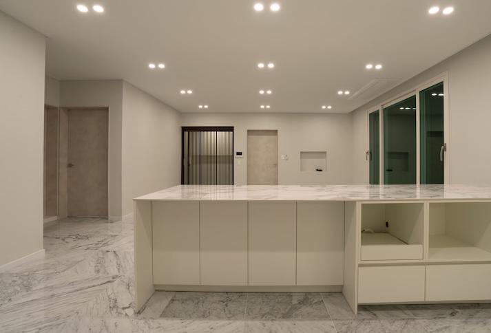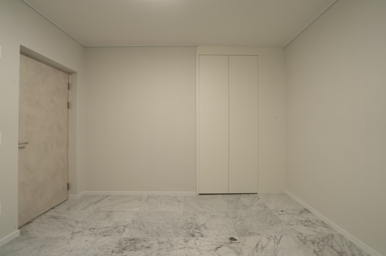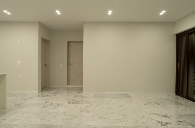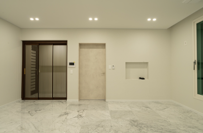 집안에 들어서면, 바닥은 천연대리석인 비앙코 까라라로 마감 했으며, 그와 어울리는 회벽 스타일의 도어 시공으로 고급스러움을 더했습니다.
