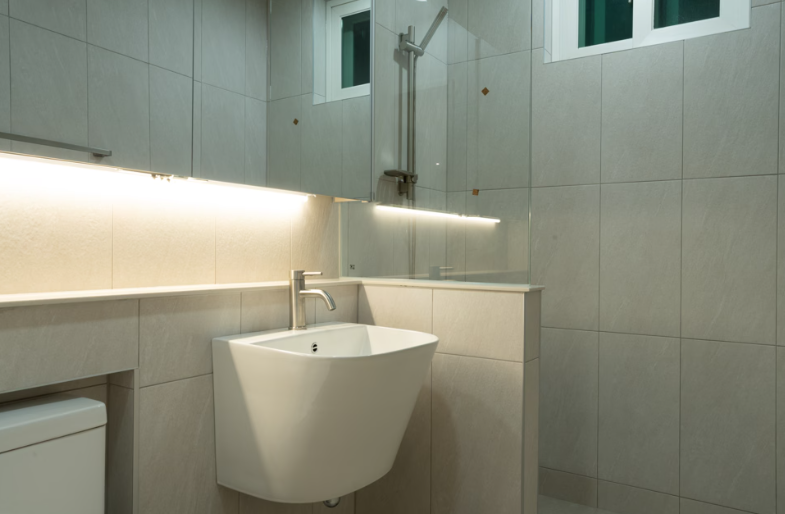 욕실 역시 부드러운 크림색 타일로 시공하여 집 전체에 통일감을 주었고, 거울 슬라이드장 하단에 간접등을 설치해 은은한 조명효과를 연출해 드렸습니다.