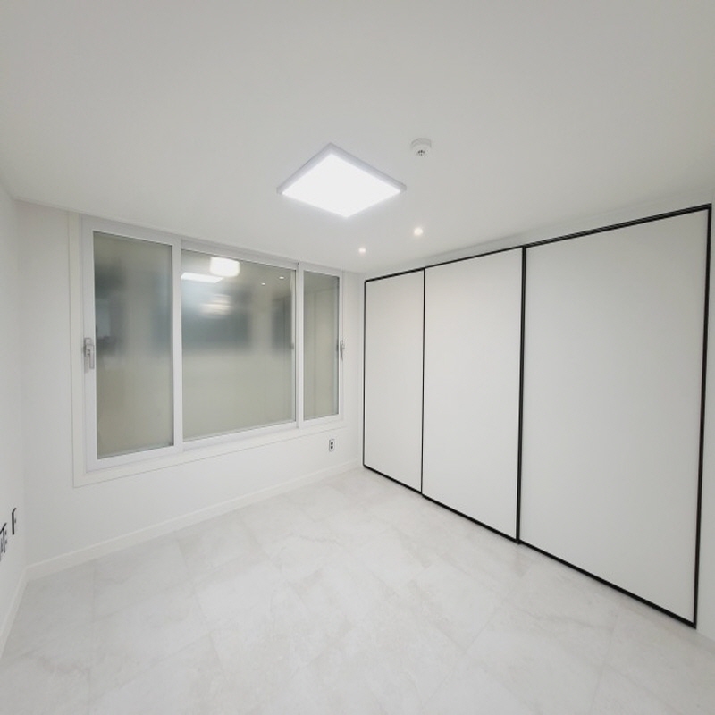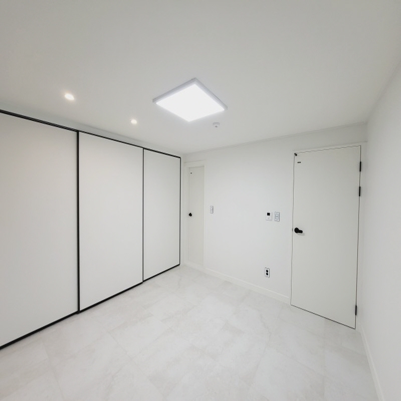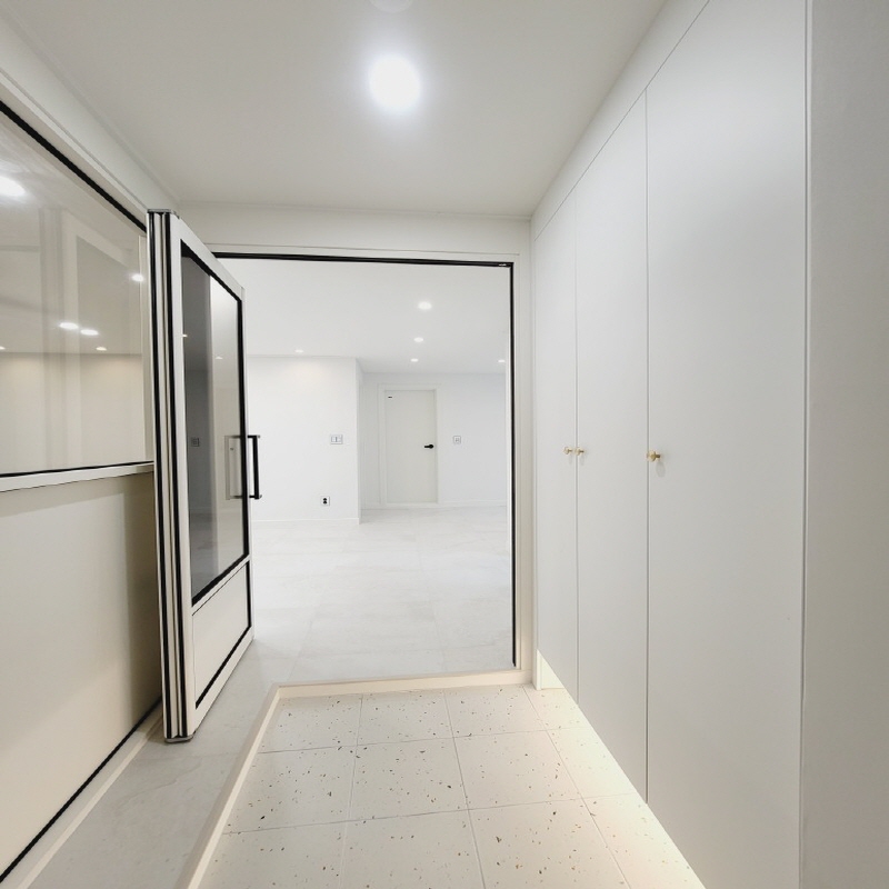 현관은 깔끔하게 화이트톤의 타일과 붙박이장을